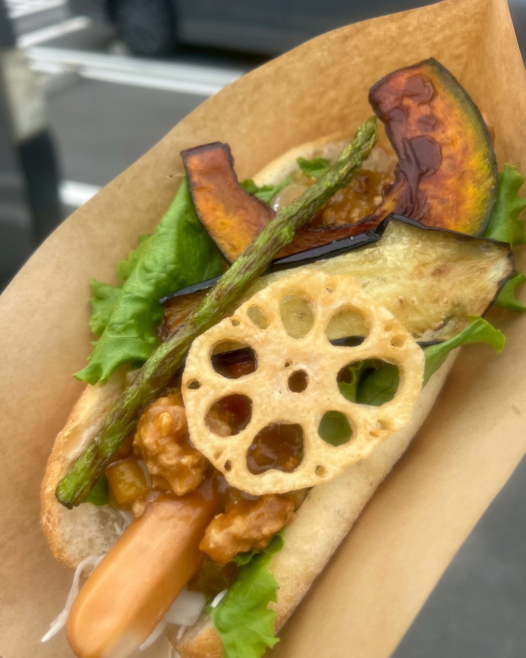 元パン職人が作る野菜たっぷりのホットドッグです。自家製キーマカレーとチーズソースかけてその上に地元栃木県産の野菜を素揚げしてふんだんにのせました。
